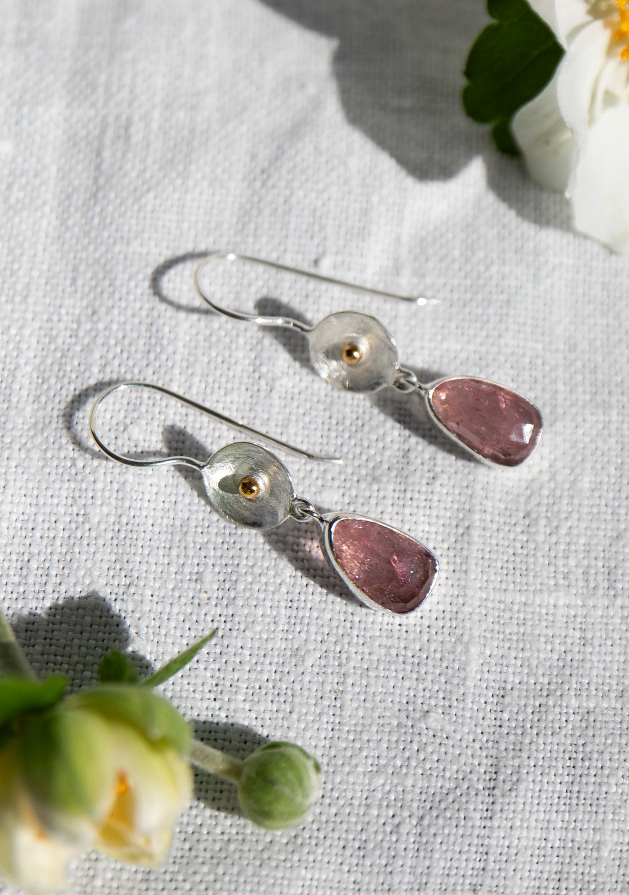 One of a kind High Quality Rose Cut Watermelon Tourmaline Drop Earrings set in 92.5% Sterling Silver with Gold Detail.