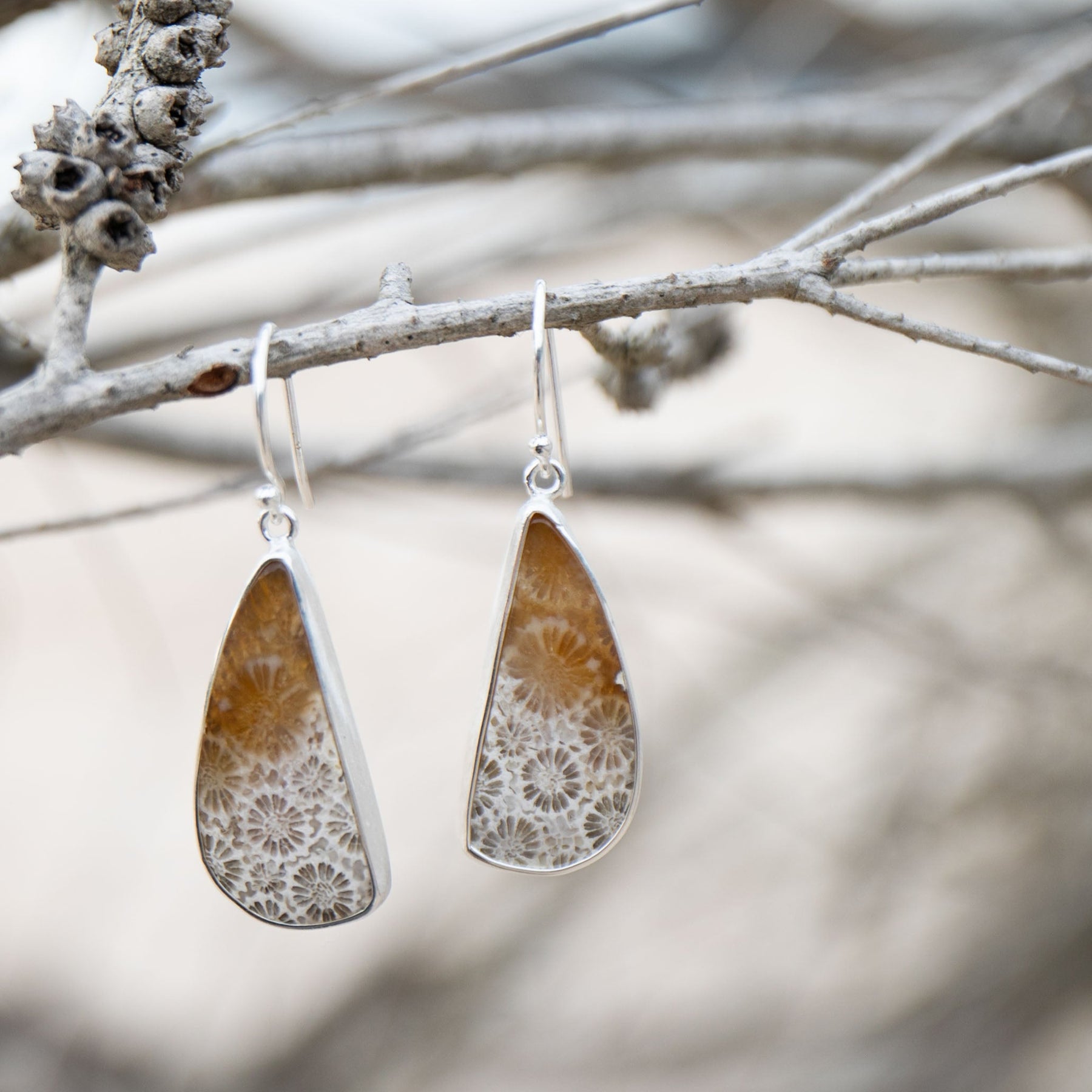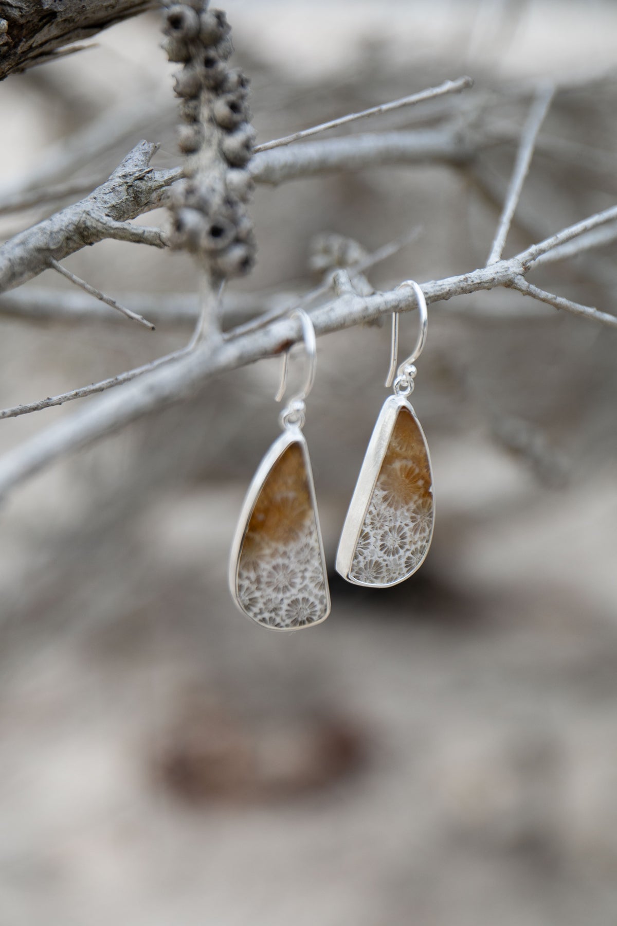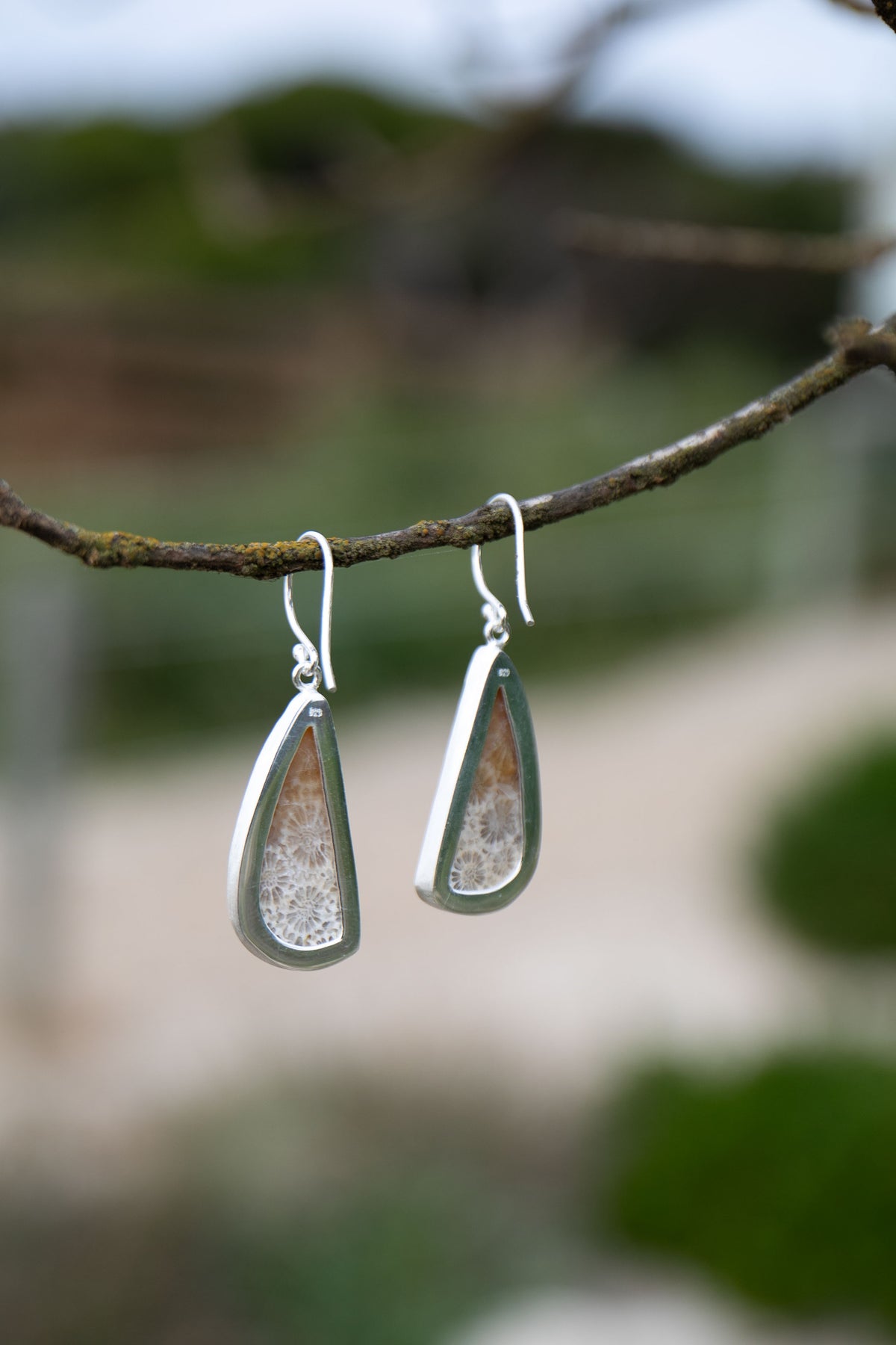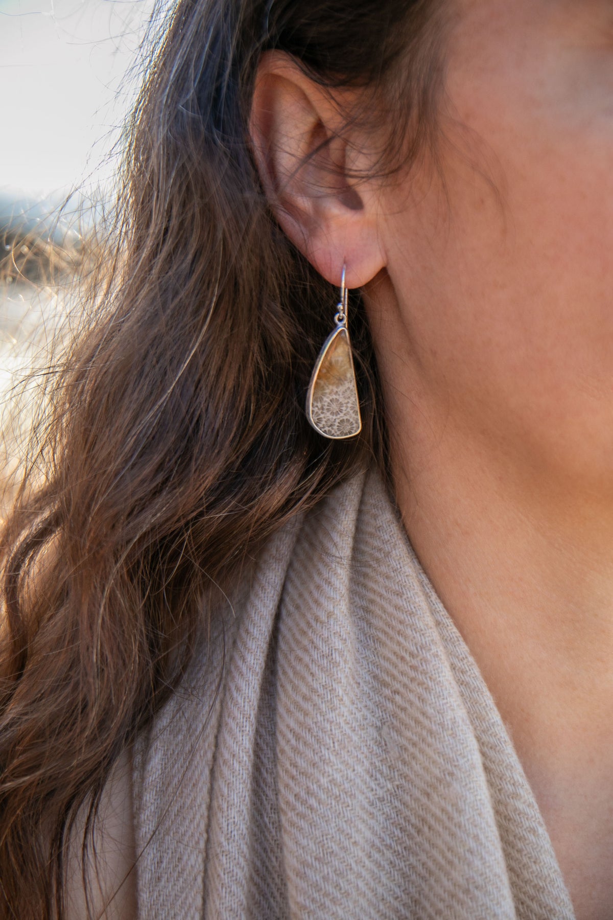 Gorgeous Statement Fossil Coral Earrings set in Brushed Sterling Silver 92.5%.
