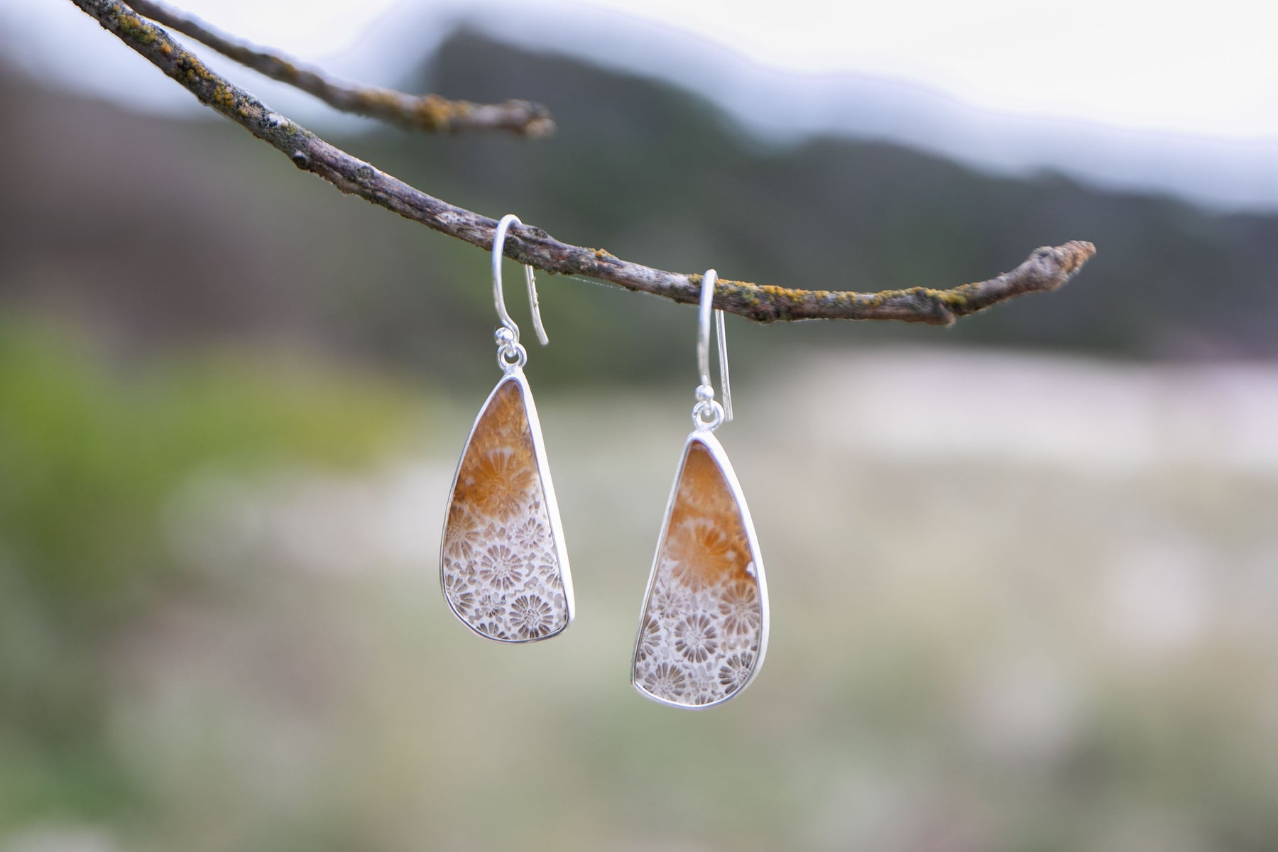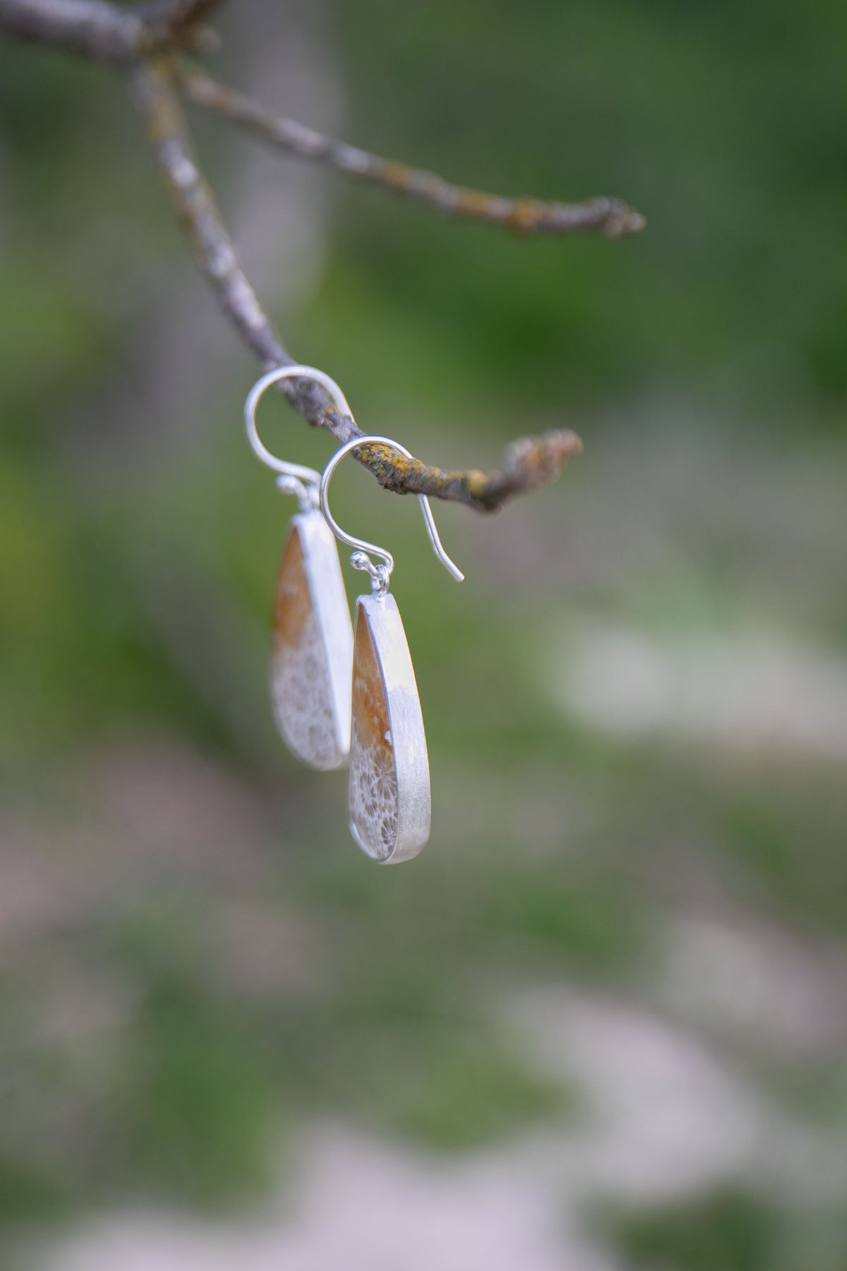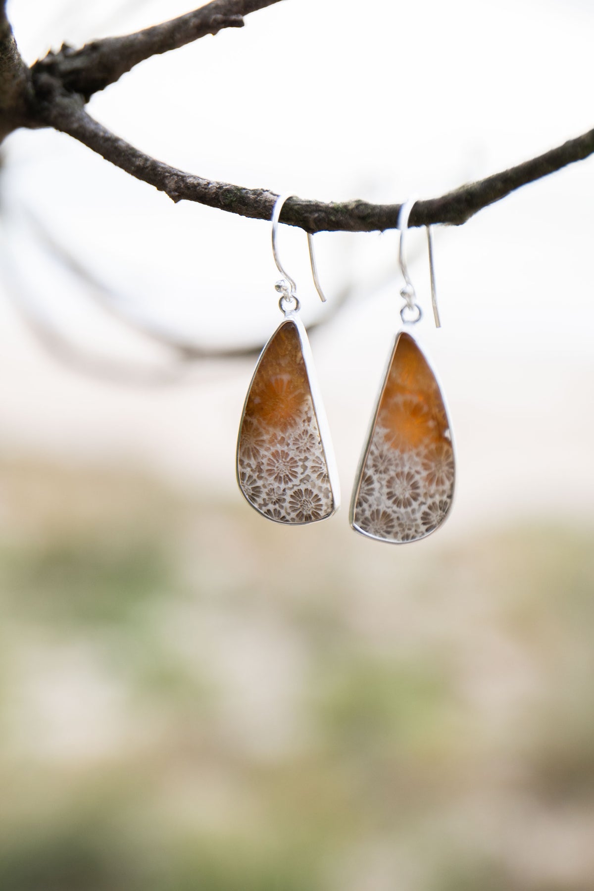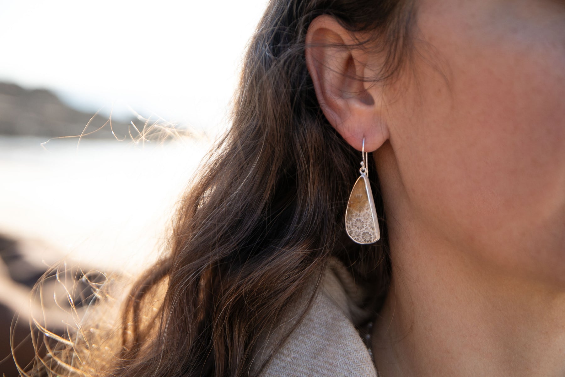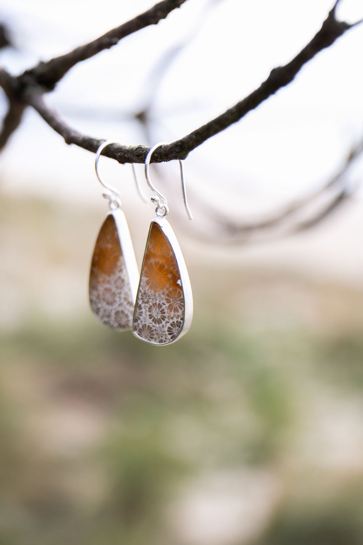 Gorgeous Statement Fossil Coral Earrings set in Brushed Sterling Silver 92.5%.